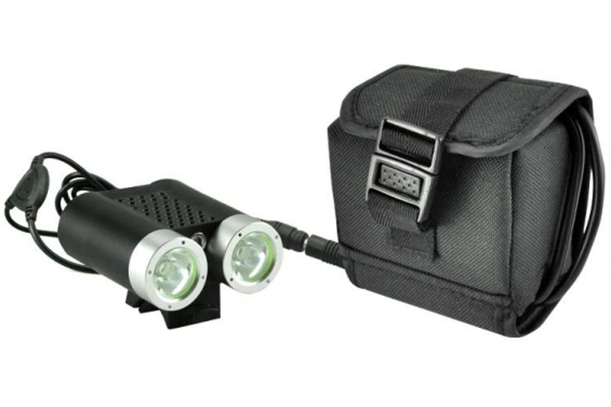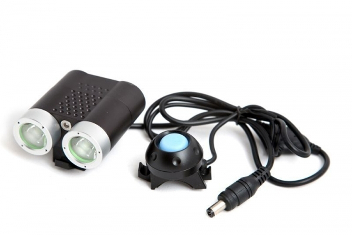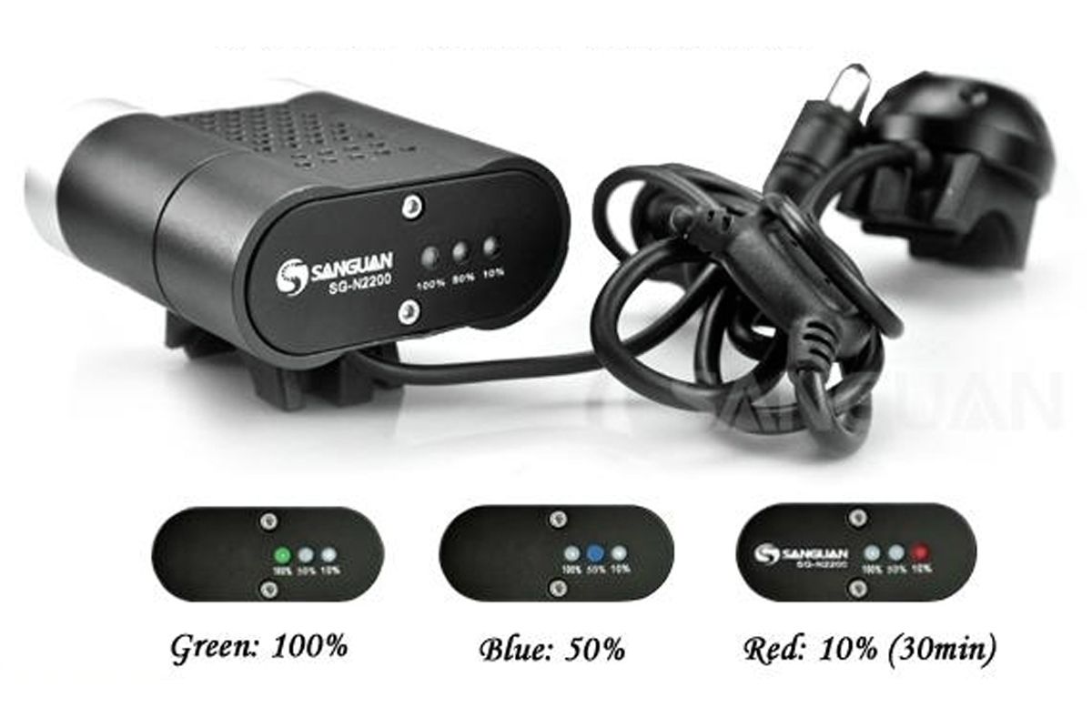 • Фонарь SANGUAN SG-N2200 образует мощное равномерное освещение на расстоянии до 50 метров. Стоит отметить полное отсутствие световых границ между зонами освещения, что очень комфортно для глаз. 2 светодиода работают от выносного блока аккумуляторов (6600mAh, 7,4V) который можно заряжать от сети 220В, с помощью зарядного устройства. Сила светового потока 2200лм. 4 режима работы: 100%, 70%, 40%, 10%. Класс влагозащиты IP66. Выносная кнопка может быть размещена в наиболее удобном месте руля, длина провода кнопки около 30см. Индикатор заряда имеет три светодиода и сообщает об уровне заряда аккумулятора на уровне 100%(зелёный), 50%(синий), 10%(красный). Заряда аккумулятора 10% хватает примерно на 30 минут работы. Фонарь может быть закреплён на руль велосипеда (резиновыми хомутами), на голову велосипедиста или на шлем, с помощью налобного крепления.