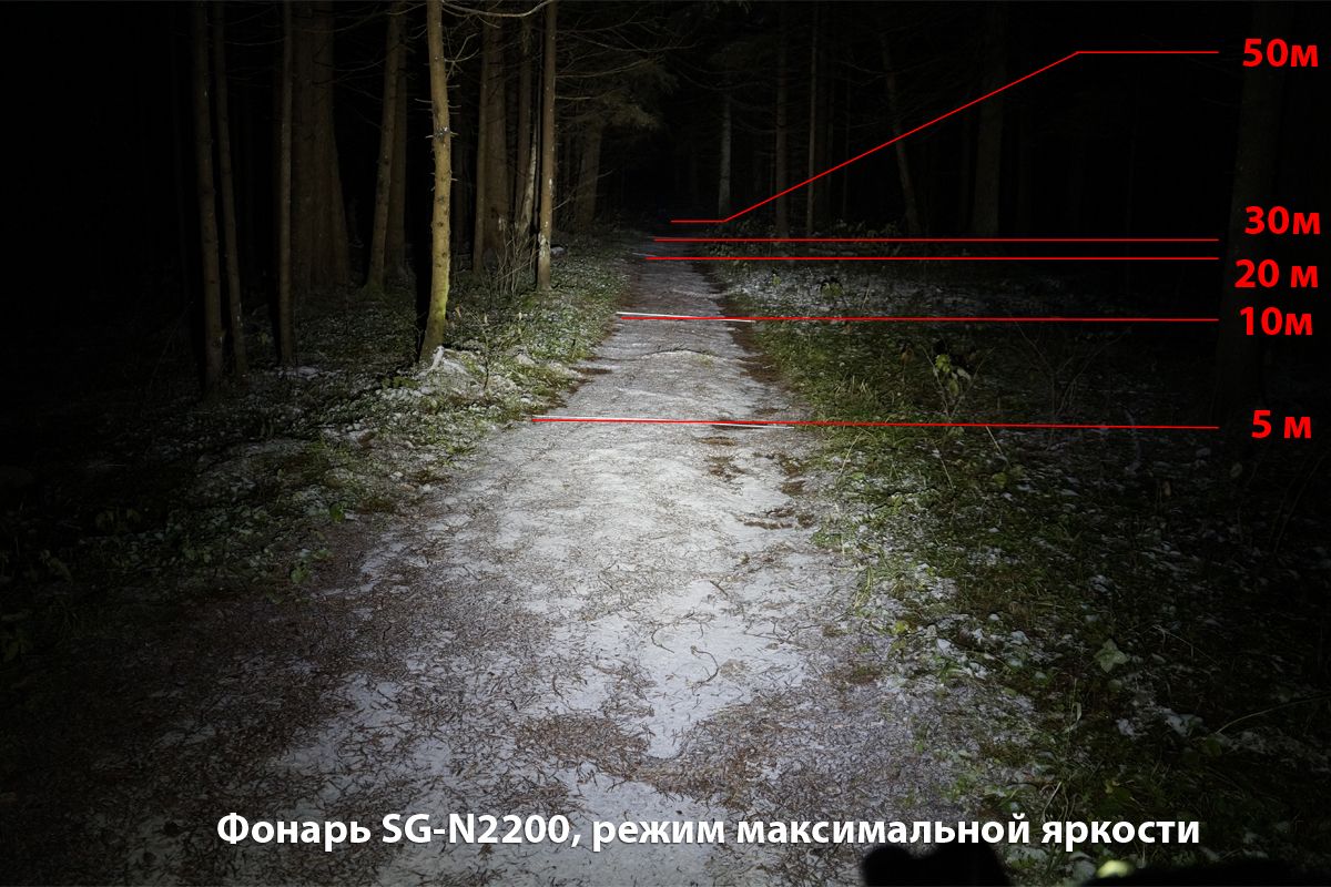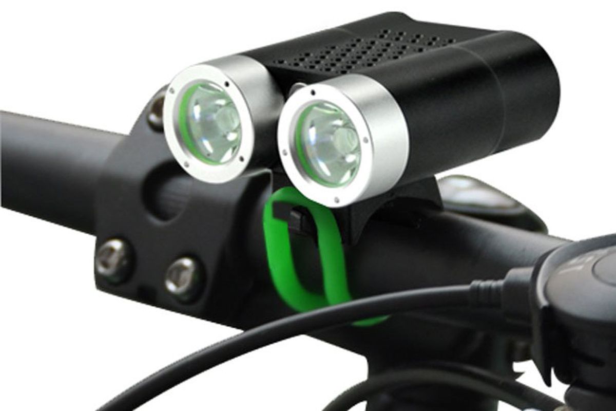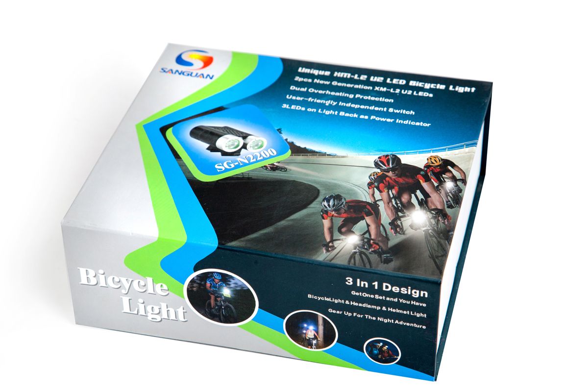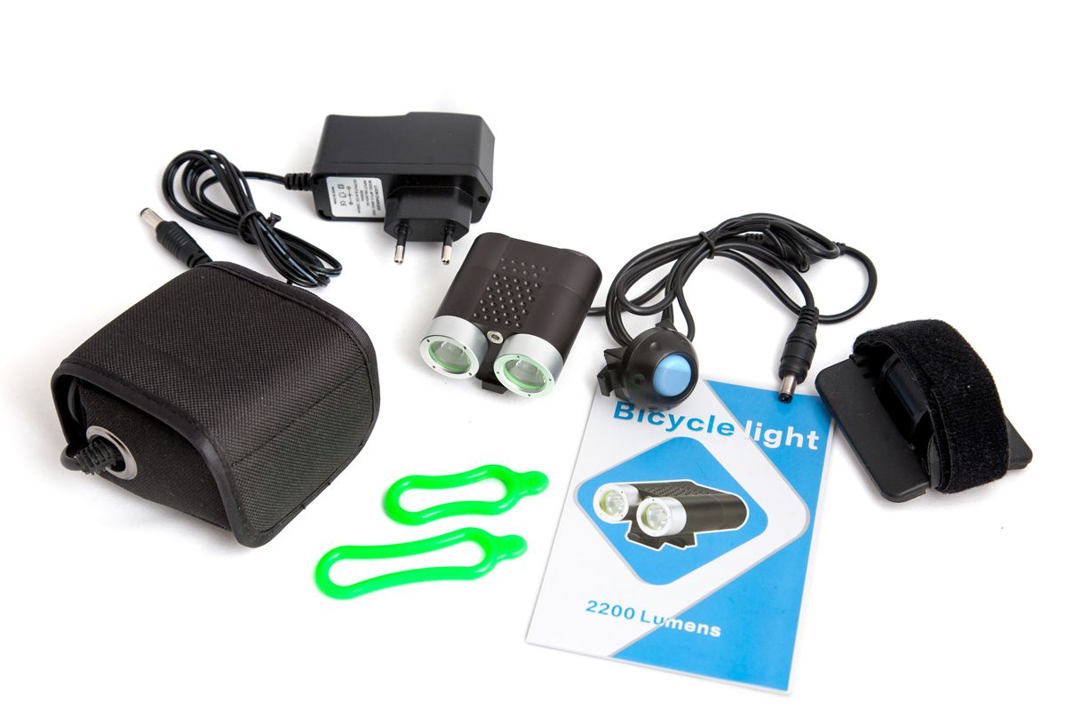 • Фонарь SANGUAN SG-N2200 образует мощное равномерное освещение на расстоянии до 50 метров. Стоит отметить полное отсутствие световых границ между зонами освещения, что очень комфортно для глаз. 2 светодиода работают от выносного блока аккумуляторов (6600mAh, 7,4V) который можно заряжать от сети 220В, с помощью зарядного устройства. Сила светового потока 2200лм. 4 режима работы: 100%, 70%, 40%, 10%. Класс влагозащиты IP66. Выносная кнопка может быть размещена в наиболее удобном месте руля, длина провода кнопки около 30см. Индикатор заряда имеет три светодиода и сообщает об уровне заряда аккумулятора на уровне 100%(зелёный), 50%(синий), 10%(красный). Заряда аккумулятора 10% хватает примерно на 30 минут работы. Фонарь может быть закреплён на руль велосипеда (резиновыми хомутами), на голову велосипедиста или на шлем, с помощью налобного крепления.